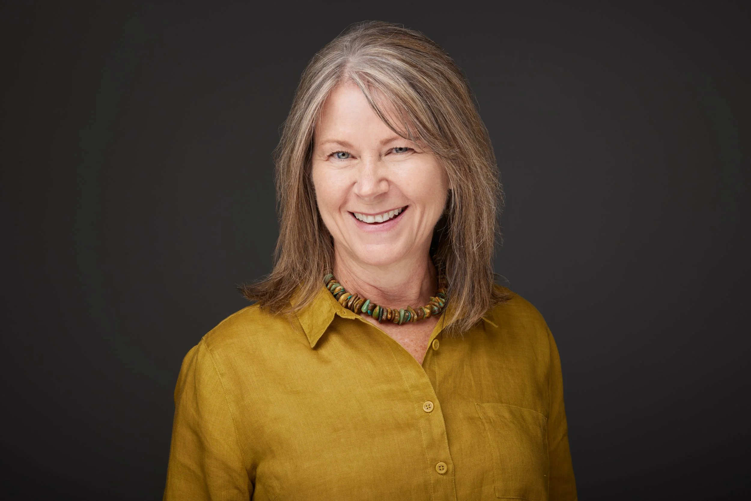 • Woman with chin-length blond hair and blue eyes. Wears a yellow shirt.