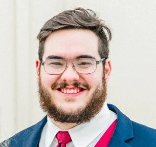 • Man with brown hair and beard, glasses, wearing a white shirt with a red tie and vest under a blue jacket