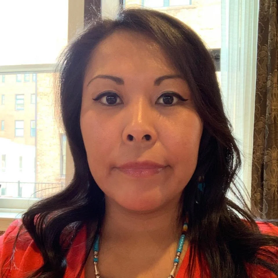 • Woman with long brown hair and brown eyes. Wears a red shirt and decorative beaded earrings in shape of a horse.